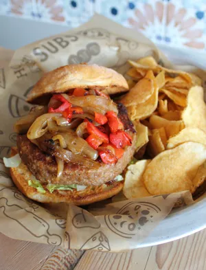 Lettuce, sauteed onions, and roasted red peppers with chips served on a gluten-free bun.